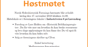 Før selve høstmøtet starter bør det også nevnes at vi holder åpent 11-14:00 og Lars Ove Wangensteen skal holde foredrag: Historien om Vilhelm Larsen Tønsagaermoen (Loa-Wilhelm) fra Eidsvoll. Hvilke andre […]