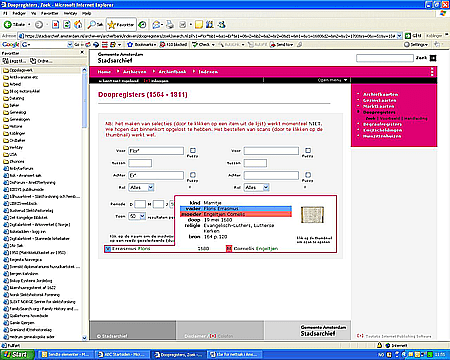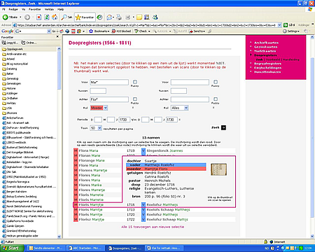 Så må jeg innrømme at jeg har jukset én gang til: Under et besøk ved Gemeentearchief rett før påske 2002, da de fortsatt holdt til i Amstelstraat 67, fikk jeg hjelp av arkivar Harmen Snel til å gjenfinne Frode Rasmussen. Snel kunne fortelle at etternavnet Rasmussen som oftest ble bokstavert Erasmus (altså på latinsk måte). Når det gjeldt fornavn Frode, mente han at dette lett kunne ha blitt til Floris på hollandsk. Amsterdam ble, som noen kanskje kjenner til, stiftet av grev Floris i 1275. Og siden mitt besøk lå forut for beslutningen om at registerkortene skulle finne sin vei til databaseprogrammene, så kunne han etter kun 4 ½ minutts leting blant index-kortene i hyllene (seksjon for Genealoogie) oppdrive en Floris Errasmus som 19. mai 1680 var oppført som far til en datter Marrjtije. Dette var i 2002 intet mindre enn voldsomt imponerende. Hvilket annet byarkiv i Europa eller verden for den saks skyld kunne oppvise noe slikt. Men det har jo også blitt bedre. I dag kan jeg gjenta det samme som for 6 ½ år siden på kortere tid enn 4 ½ minutt, men da også fra hvor som helst i verden. Se bare selv: