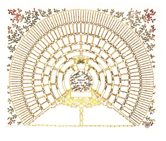 - Hvit bunn med gule rammer om navnefelt og rødt og grønt løvverk