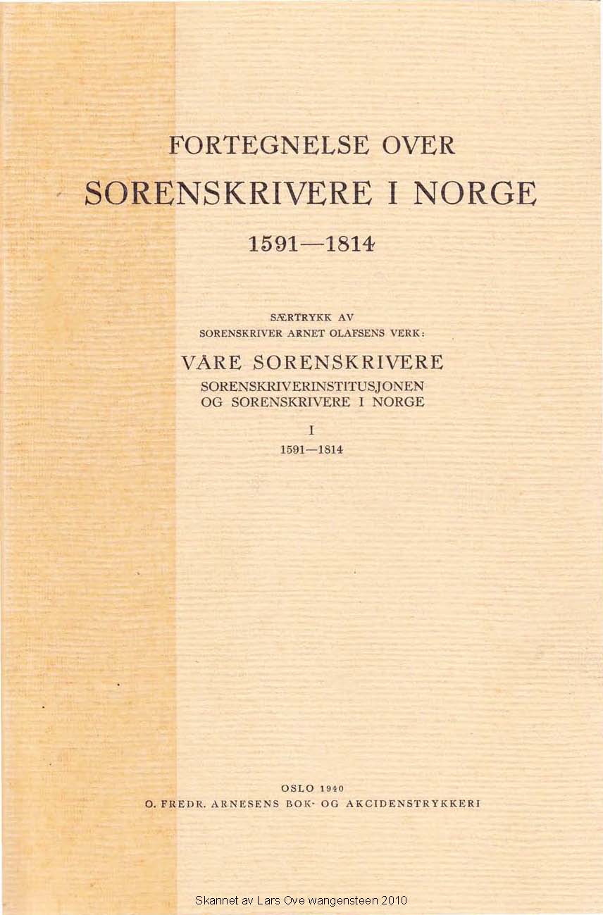 Særtrykk av sorenskriver Arent Olafsens verk «Våre Sorenskrivere i Norge» Utgitt 1940. 128 sider