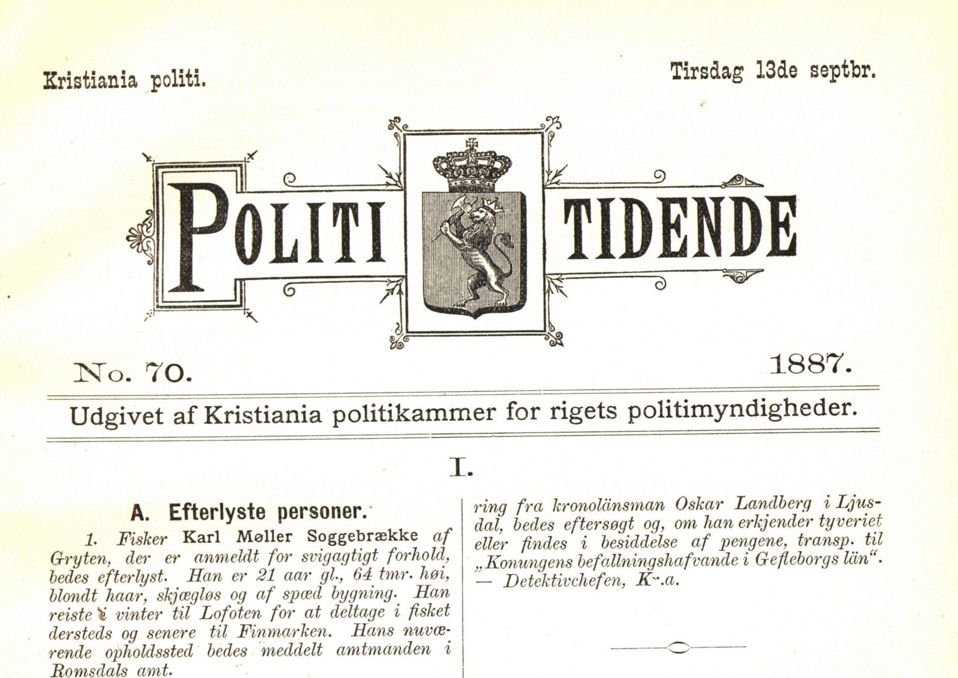 | Polititidende | 1886 (PDF-fil til nedlasting), 1887 (PDF-fil til nedlasting), 1888 (PDF-fil til nedlasting), 1889 (PDF-fil til nedlasting), 1890 (PDF-fil til nedlasting), 1891 (PDF-fil til nedlasting), 1892 (PDF-fil til nedlasting), 1893 (PDF-fil til nedlasting), 1894 (PDF-fil til nedlasting), 1895 (PDF-fil til nedlasting), 1896 (PDF-fil til nedlasting), 1897 (PDF-fil til nedlasting), 1898 (PDF-fil til nedlasting), 1899 (PDF-fil til nedlasting), 1900 (PDF-fil til nedlasting) |