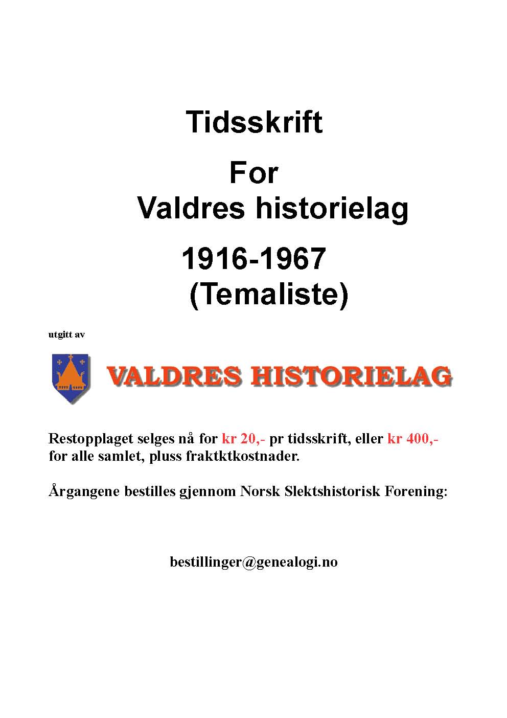 Tidsskrift For Valdres historielag 1916-1967 (Temaliste – Innholdsfortegnelse)