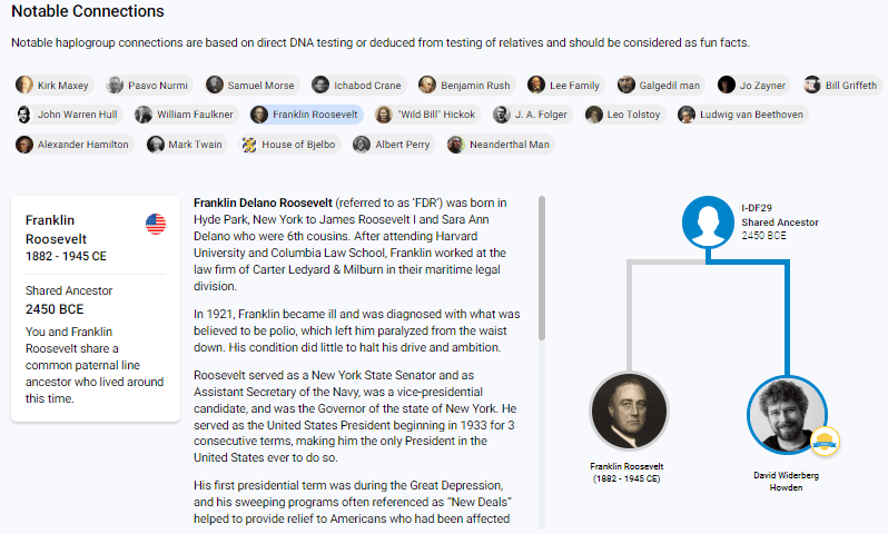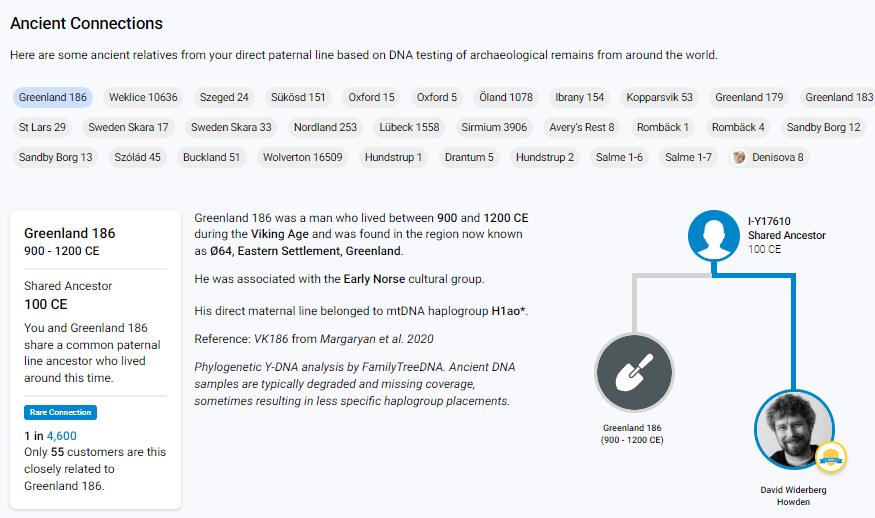 Her får du et estimat på hvor langt tilbake i tid du deler din farslinje med andre testere, noe som kan være avgjørende for å bekrefte hvordan og om to farslinjer har et felles opphav. Du vil også kunne se din egen plassering i treet i forhold til andre: