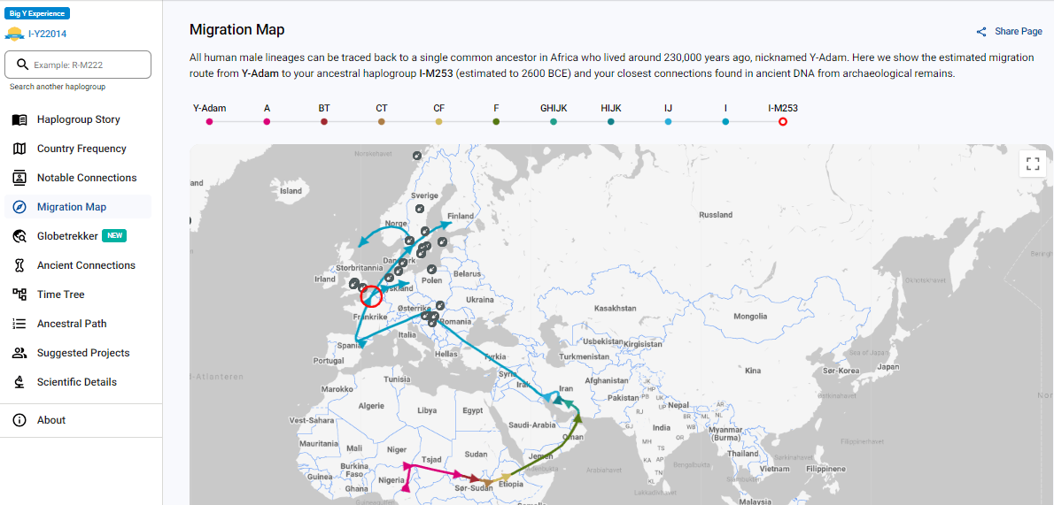 Dette kartet knytter da migrasjonene til hvor din eldste oppgitte stamfar er plassert og du vil kunne se hvor din farslinje var gjennom årtusene. Med andre rapporter vil du kunne se hvor nært beslektet du er med arkeologiske funn: